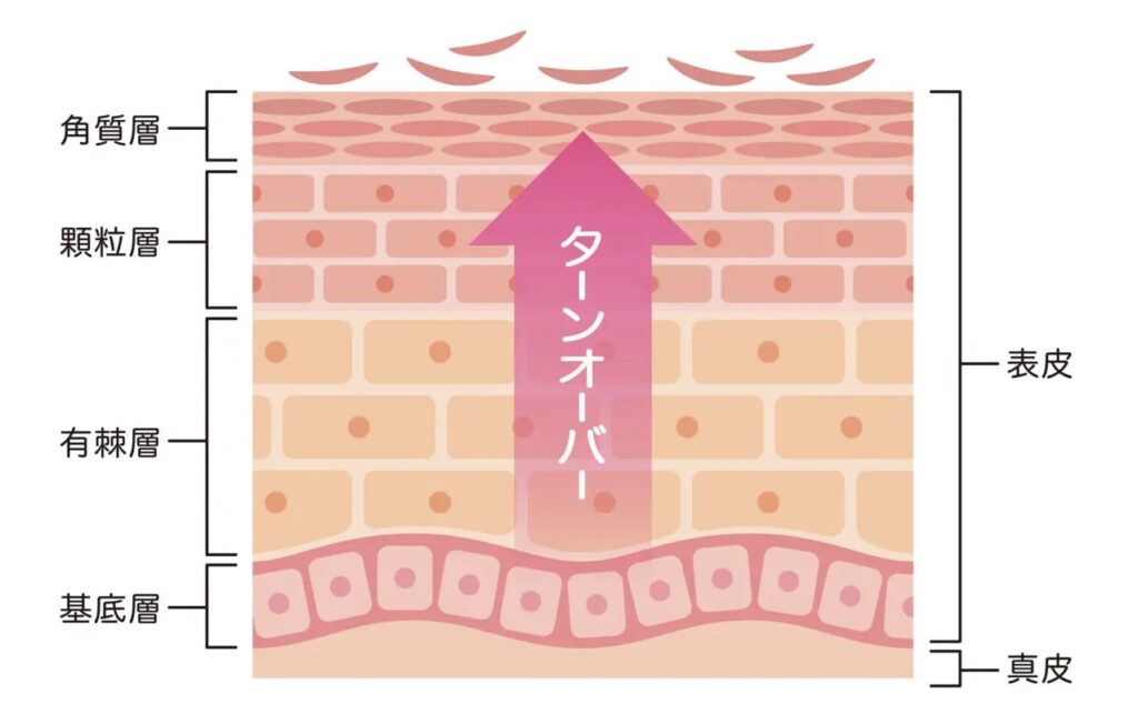ピーリングは肌のターンオーバーを促進する美容医療です。ターンオーバーは、表皮の最深部の「基底層」で新しい細胞が作られるところからスタート。誕生した細胞は有棘層、顆粒層、そして外から見える角質層へと移動していき、最後には角質として剥がれ落ちます。